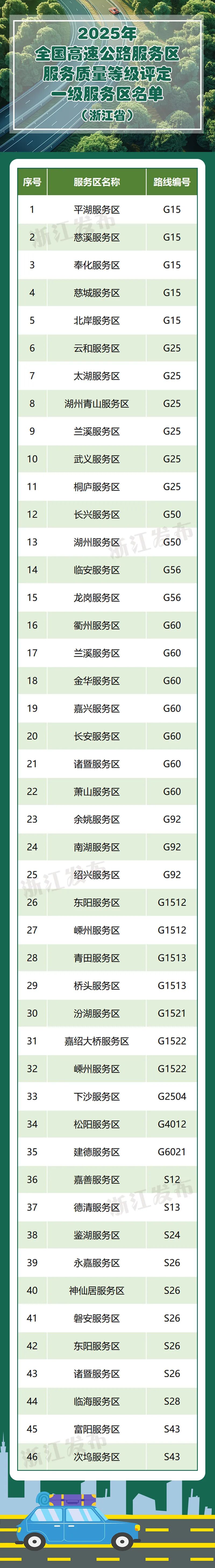 近日,交通运输部办公厅公布2025年全国高速公路服务区服务质量等级评定一级服务区名单,共365个服务区入选。其中,浙江省有46个服务区上榜↓↓